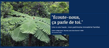 Dans le cadre de la liaison collège-lycée, pour cette dernière étape du concours de lecture à voix haute "Ecoute-nous, ça parle de toi" 2025, nous vous proposons de parcourir la StoryMap autour du patrimoine immatériel familial de nos élèves.